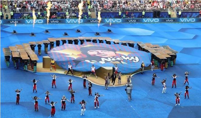 當(dāng)天的閉幕式上,莫斯科盧日尼基體育場被裝點(diǎn)成藍(lán)色的海洋。伴隨著有節(jié)奏的音樂,演員們迅速集結(jié)到舞臺前,面向球員通道入口,這時(shí)候那些屏幕組成了一個(gè)矩形的顯示屏,投影播放本屆世界杯的精彩鏡頭集錦,把現(xiàn)場球迷拉回到那一個(gè)個(gè)令人難忘的日日夜夜。