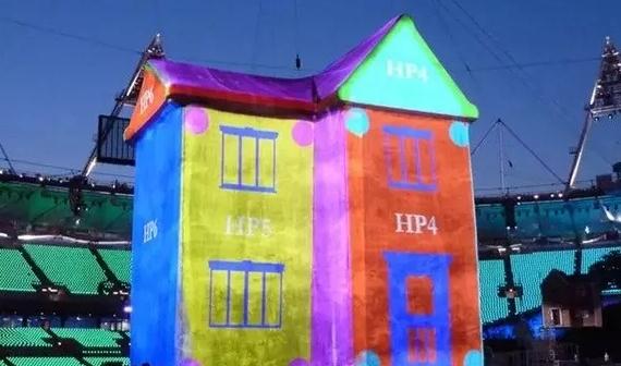 2012年倫敦奧運(yùn)開幕式上神奇的劇場:一位母親開車帶著兒子回家,舞臺中央奇跡般地出現(xiàn)了一幢別墅,一家人歡樂地聚餐,觥籌交錯(cuò),小兒子則在別墅門口投入地玩游戲機(jī);