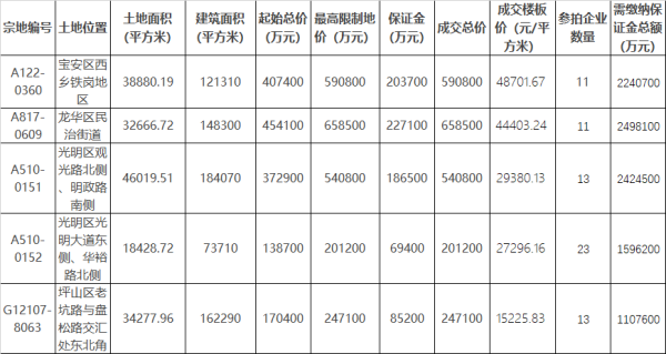歷經(jīng)300多輪"激戰(zhàn)",位于寶安西鄉(xiāng)、龍華民治、光明觀光路、光明光明大道、坪山區(qū)老坑路4區(qū)的5宗宅地分別被廣州越秀、龍光、中海、電建、平安競得。具體如下: